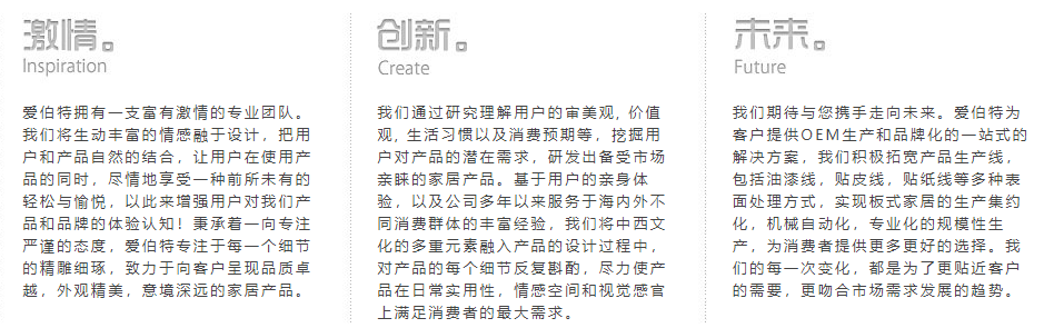 愛伯特家居有限公司屬中外合資企業(yè),成立于2007年,坐落于福建漳州北斗工業(yè)園區(qū),占地66000平方米。對(duì)于板式家具,木質(zhì)家居產(chǎn)品,我們專業(yè)的團(tuán)隊(duì)有著世界頂級(jí)的生產(chǎn)能力,產(chǎn)品原料及品質(zhì)要求符合國際各類管理體系的標(biāo)準(zhǔn)。愛伯特自創(chuàng)始之日起至今,始終保持超乎尋常的成長速度。我們與(HomeDepot,Lowes,Aldi,Lidl